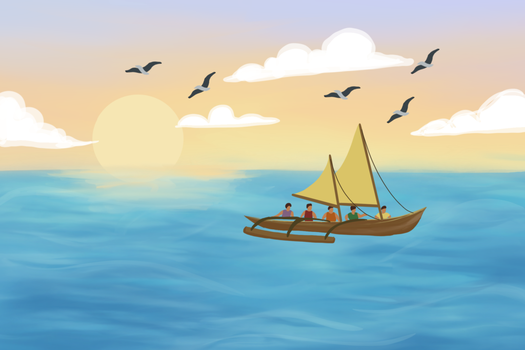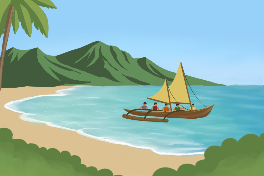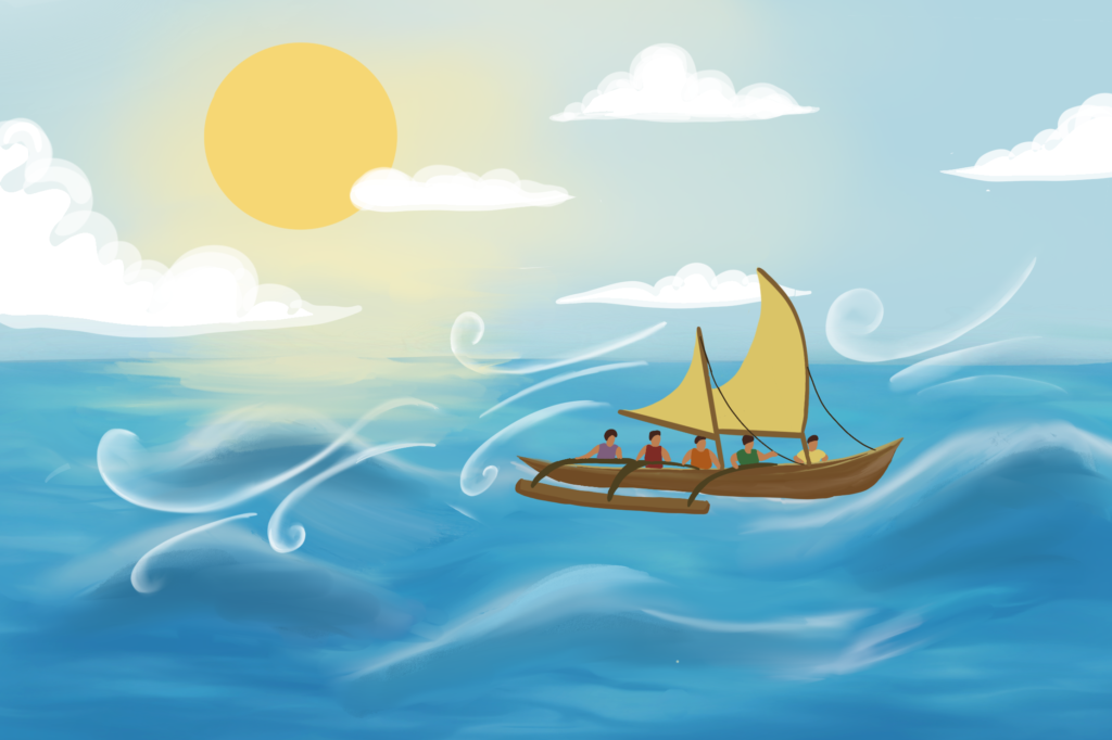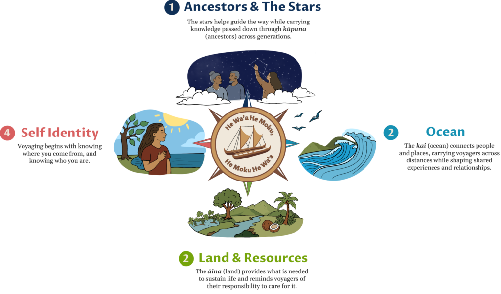 These visuals were designed to support the written and video storytelling by making complex ideas more accessible and engaging. One key concept explored was the relationship between people, land, ocean, and navigation, often expressed through the idea that “the canoe is the island and the island is the canoe.”