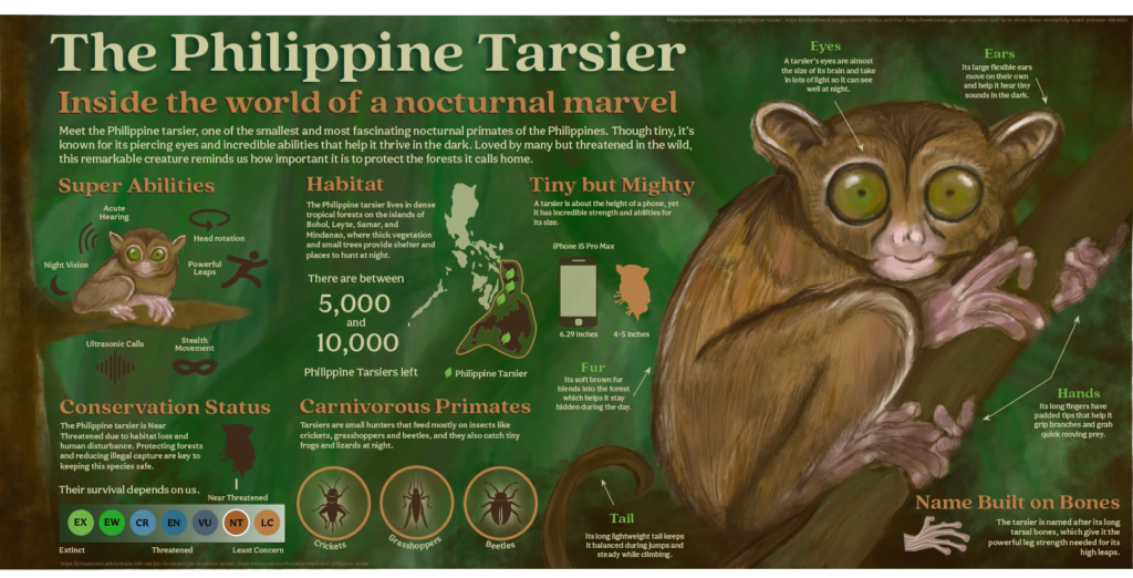 This infographic was especially meaningful because I illustrated the Philippine tarsier entirely by hand using Procreate, then brought the layout and visual explainers together in Adobe Illustrator. I wanted the main illustration to feel organic and lifelike, while the rest of the design supported it with clear information, labels, and iconography. Growing up Filipino, the tarsier is a culturally significant animal I’ve known about since I was young, so this project gave me a chance to explore it more deeply through research and storytelling. My goal was to balance education and artistry by using natural textures, warm earth tones, and a rainforest-inspired style that reflected its habitat. This project helped me combine traditional drawing with digital design, creating an infographic that celebrates both the tarsier’s uniqueness and its importance to Philippine wildlife.