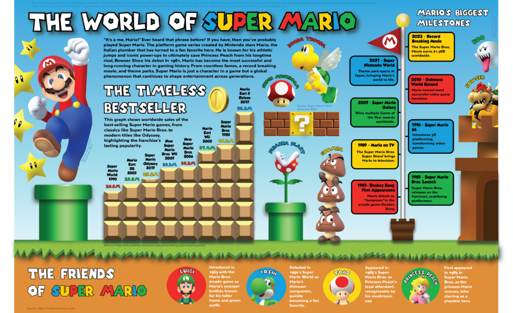 This project challenged me to turn the world of Super Mario into a clear, information-focused design while still keeping the playful look of the game. I created an 11 × 17-inch infographic in Adobe Illustrator inspired by the ending scene where Mario climbs the flagpole, using it as the main layout for organizing facts and visuals. I brought in familiar characters, block elements, and a game-style color palette to make it feel authentic and nostalgic. Throughout the process, I focused on keeping the information easy to read while letting the visuals support the story. This project helped me learn how to balance detailed research with a fun, themed design, especially for something that feels meaningful to me as a long-time Super Mario fan.