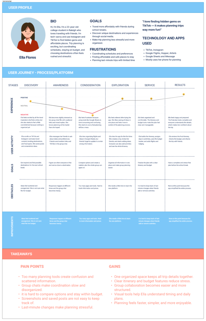 I started with interviews and secondary research on how young travelers plan trips. I learned that people constantly switch between apps, lose links, and struggle to keep everyone on the same page with costs and dates. These findings shaped my user story, task flow, and journey map around a traveler like Ella trying to plan a group trip on a budget.