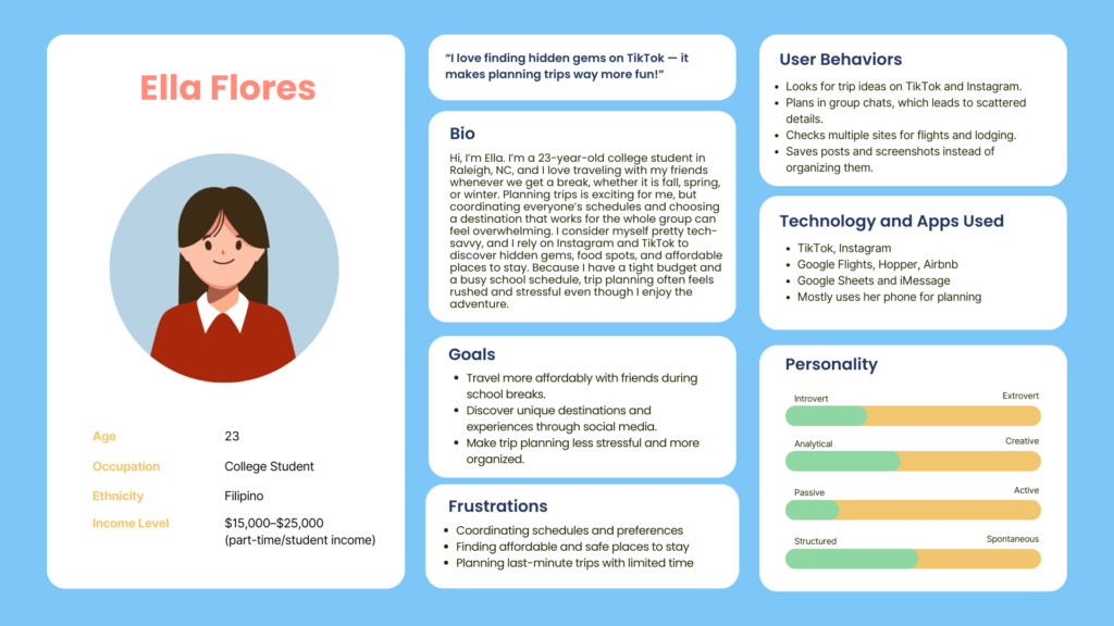 VoyaGo is designed for Gen Z and Millennial travelers who love planning trips with friends but often feel overwhelmed by having information in too many places. My persona, Ella, represents young travelers who are busy, on a budget, and usually take the lead in organizing group trips. She finds inspiration through TikTok and Instagram, but keeping track of links, dates, and costs across group chats, booking sites, and spreadsheets becomes confusing. She needs one place where everything for the trip is organized, easy to update, and simple to share with others.
