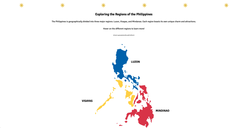 Main Interactive Graphic: Each star represents an aspect of the Philippines, offering interactive content. Users can click on the stars to view introductory information about the country.