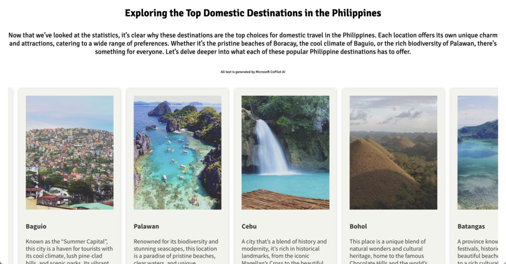 The “Welcome to the Philippines” interactive travel guide is a single-page web app that offers an engaging way to explore the Philippines. Built with HTML, CSS, and JavaScript, users can interact with clickable stars to learn about key tourist destinations and click on areas of a map to view more details. The app also features a Flourish chart to visualize popular tourist spots. Combining interactive elements with informative content, this project helps users discover the beauty and culture of the Philippines.